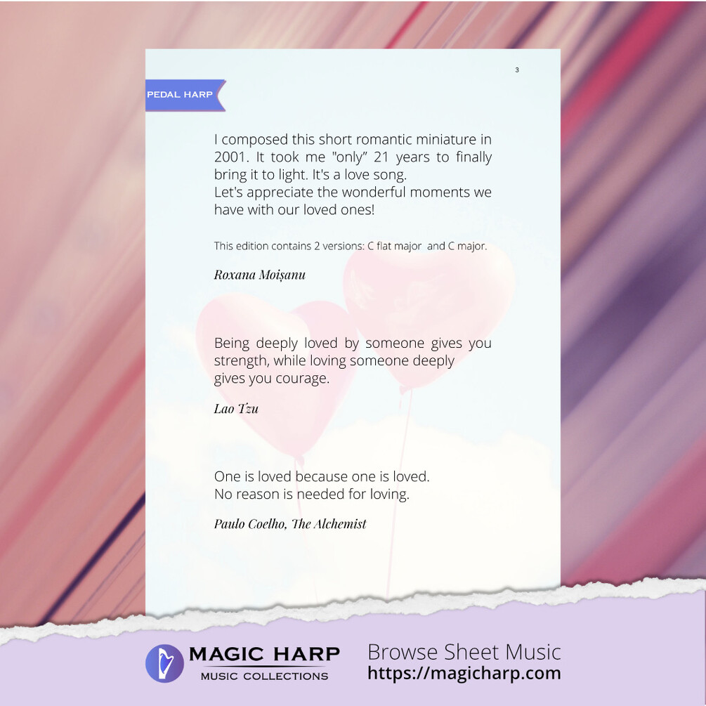 Roxana Moișanu, professional harpist, presents Magic Harp Music Collections: musical scores for lever harps, pedal harps, lap harps, chamber music, originals, and arrangements.